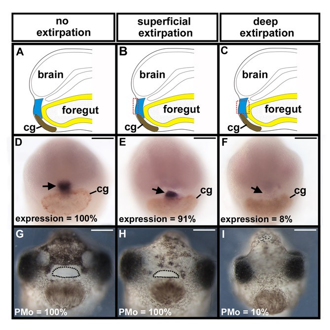 Fig. S4. Requirement of the frzb-1/crescent expression domain for primary mouth formation. Fate mapping has shown that the region expressing frzb-1 becomes the primary mouth (data not shown) (Dickinson and Sive, 2006). Removing the superficial layers of ectoderm does not affect primary mouth formation (Dickinson and Sive, 2006), probably because frzb-1/crescent expression is restricted to deeper layers. We tested whether the frzb-1/crescent expression domain was required for primary mouth formation by performing extirpations. Arrows indicate the presumptive primary mouth; cg, cement gland. (A-C) Schematic of dissections at stage 23-24 depicting anterior ectoderm (blue), foregut epithelium (yellow), and dissected regions (dotted red box). (D-F) frzb-1 in situ hybridization immediately after dissection. frzb-1, purple/blue; xcg, orange. Scale bars: 200 . (D) In un-operated embryos, the frzb-1 expression domain is normal 100% (n=10). (E) In 91% of embryos with superficial extirpations, the frzb-1 expression domain is normal (n=11). (F) Embryos receiving the deep extirpations rarely (8.3%) contain significant frzb-1 expression (n=12) (G-I) Frontal view of representative embryos at stage 40, showing the effect of the extirpations on the formation of the primary mouth; the opening is outline by a dotted black line. Scale bars: 250 . (G) 100% of un-operated embryos have a normal primary mouth (n=10). (H) 100% of embryos with the superficial ectoderm removed have a normal primary mouth (n=10). (I) 90% of embryos having the deep ectodermal extirpations do not form a primary mouth (n=10). |