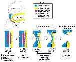 Fig. 8. Model of frzb-1/crescent function in primary mouth formation. At neurula stages (stage 17-22), frzb-1 and crescent are expressed in a subset of cells that will form the primary mouth (purple). In these cells, frzb-1 and crescent inhibit Wnt signaling, which in turn prevents the continued synthesis of proteins Laminin and Fibronectin. Without such proteins, the basement membrane integrity is lost and by early tailbud stages (stage 24-26) it disappears. The dissolution of the basement membrane leads to subsequent stages of primary mouth development including cell death, invagination, thinning and finally perforation. frzb-1/crescent-expressing cells are colored purple; ectoderm, blue; endoderm, yellow. The basement membrane (BM) is indicated by a black line; cg, cement gland. |