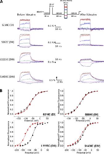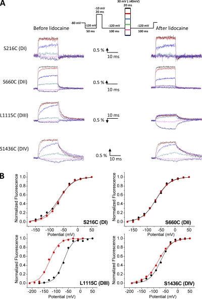 Figure 3. The effect of lidocaine on the on the voltage-dependent fluorescence of labeled sodium channel domains. (A) Time-dependent fluorescence changes from TMR-labeled S216C, S660C, L1115C, and S1436C channels before (left) and after (right) 10 mM lidocaine application. Inset shows the pulse protocol. Each trace was obtained by averaging 10 trials with an interval of 1 s between pulses. The y axis in the scale bar represents percent fluorescence change (ÎF/F). L1115C fluorescence traces were inverted for comparison. (B) Steady-state F-V relationship of TMR-labeled S216C, S660C, L1115C, and S1436C channels before (black) and after (red) a 10-mM lidocaine application. Circles represent the means ± SE of at least five independent experiments, whereas the lines represent the best fits of the averaged data to a single Boltzmann function.