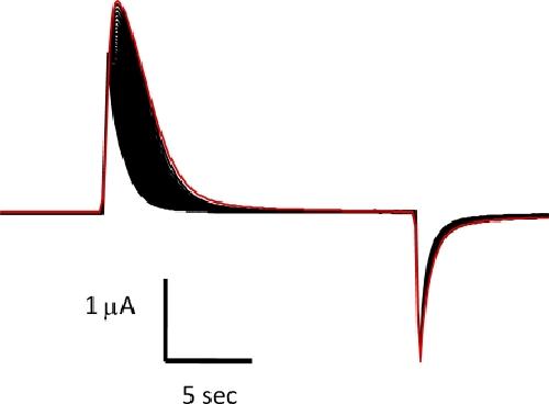 Figure 5. The effect of saturating concentrations of QX-314 on ionic currents of the sodium channel. Use-dependent block of outward potassium currents through the sodium channel obtained by repetitively pulsing in the presence of 3 mM QX-314. Red trace represents the current in the absence of QX-314. 10 min after the application of 3 mM QX-314 to the internal solution, ionic currents (black) were recorded by repetitive pulses (10 Hz frequency) to −10 mV for 20 ms after a −120-mV prepulse for 50 ms.