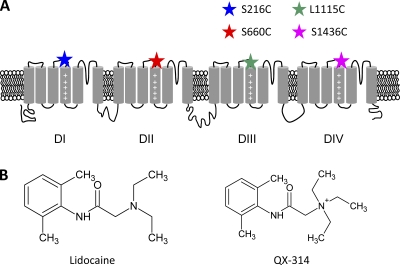 Figure 1. A schematic of the sodium channel and chemical structures of local anesthetics. (A) A schematic diagram of the α-subunit of the sodium channel. Positions of the substituted cysteines at S216 (domain I [DI]), S660 (domain II [DII]), L1115 (domain III [DIII]), and S1436 (domain IV [DIV]) are depicted as colored stars. (B) Chemical structure of lidocaine and QX-314.