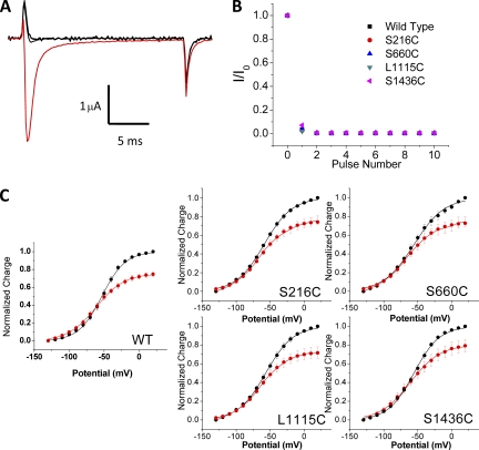 Figure 2. The effect of saturating concentrations of lidocaine on ionic and gating currents of the sodium channel. (A) Development of ionic current block in the presence of 10 mM lidocaine in wild-type sodium channels. The ionic currents were elicited by pulsing to â10 mV for 20 ms with a prepulse to â120 mV for 50 ms. Red trace shows the currents obtained before the addition of lidocaine. A family of 100 traces was recorded by pulsing at 10 Hz 5 min after lidocaine application (in black). Ionic current blockade was nearly complete after the first pulse. These recording were obtained with 23 mM sodium in the external solution. (B) Fractional ionic current block of wild-type and mutant sodium channels elicited by repetitively pulsing to â10 mV (10 Hz frequency) after the addition of 10 mM lidocaine. The currents were normalized to the ones obtained before the addition of lidocaine. (C) Effect of 10 mM lidocaine on the steady-state Q-V relationships of wild-type and mutant channels. The dark lines and symbols show the data in control (with TTX and no lidocaine), while the red lines and symbols show the data after lidocaine application. Filled circles represent the mean ± SE of at least four independent experiments, and lines represent the best fits of the averaged data to a Boltzmann function. Measured gating charges at each potential were normalized to the maximum charge determined for each oocyte without lidocaine.