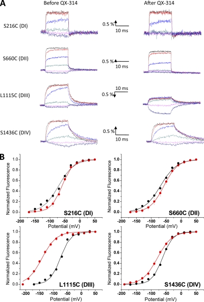 Figure 6. The effect of saturating concentrations of QX-314 on the voltage-dependent fluorescence of labeled sodium channel domains. (A) Time-dependent fluorescence changes from TMR-labeled S216C, S660C, L1115C, and S1436C channels are shown before (left) and after (right) the application of 3 mM QX-314. 10 min after the application of QX-314, oocytes were pulsed repetitively until ionic current block was complete (typically 200 pulses). Traces were obtained by averaging 10 trials per test potential with an interval of 1 s between pulses. The y axis in the scale bar represents percent fluorescence change (ÎF/F). L1115C fluorescence traces were inverted for comparison. (B) Effect of 3 mM QX-314 on the steady-state F-V relationship of S216C, S660C, L1115C, and S1436C channels. Black and red traces represent the data before and after QX-314 application, respectively. Symbols represent the mean ± SE of at least five independent experiments, and lines represent the best fits of the averaged data to a single Boltzmann function. Steady-state fluorescence intensities at each potential were normalized to the maximum changes in fluorescence in each oocyte.