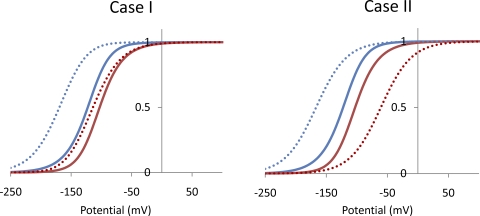 Figure 8. Simulations of F-V relationships in a simplified model system to consider two possible perturbations by the local anesthetic. Simulated F-V curves tracking the voltage sensor movement (R→A transition) in the two subunits of a hypothetical channel (Subunit X [red] and Subunit Y [blue]). (Left) The effect of a perturbation that stabilizes the open state (K4 = 100) of the subunit Y while the coupling remains intact (n = 10) on the F-V curves of the two subunits (Case I). (Right) The effect of perturbations stabilizing the open state (K4 = 100) of the subunit Y and disrupting the interdomain interaction (n = 1) on the F-V curves of the two subunits (Case II). Both panels show that the F-V curves before (solid lines) and after perturbation (dashed lines). All parameters are listed in Table IV.