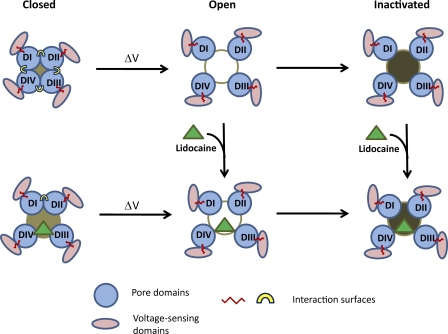 Figure 9. A schematic depicting a preliminary model of sodium channel modulation by local anesthetics. Local anesthetic binding to the open and inactivated state primarily stabilizes the pore segments of domain III and to some extent of domain IV in the open state. Because the movement of pore helices (blue circles) is coupled to the voltage sensor (pink ellipsoids), local anesthetic binding also stabilizes the voltage sensors of domains III and IV in the activated state. The interdomain interaction is mediated by the residues near the inner helix bundle crossing. In this model, as in the potassium channel, these residues interact in the closed state of the channel. This interaction is disrupted if the local anesthetic acts as a wedge and prevents the S6 segments of domains III and IV from fully closing.