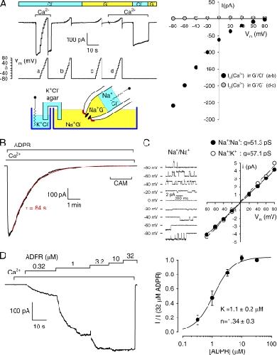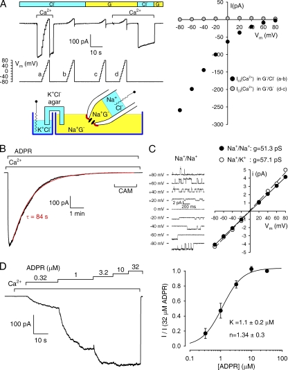 Figure 1. Basic properties of human TRPM2 channels expressed in Xenopus oocytes. (A, left) Cartoon (bottom) illustrates conditions to eliminate endogenous Ca2+-activated Cl− currents (top). Steady-state membrane currents in an inside-out patch from a noninjected oocyte, elicited by sequences of voltage steps between –80 and +80 mV (a–d), were assayed in the absence (b and c) and presence (a and d) of bath Ca2+ with gluconate (G−) as the main anion in the pipette but Cl− (a and b) or G− (c and d) alternating (colored bar) in the bath. (right) Ca2+-activated currents as a function of voltage for the G−/Cl− (black circles) and G−/G− (gray circles) conditions. Bath-free [Ca2+] was 125 µM during test a and 1 mM during test d; K1/2 for the Ca2+-activated Cl− current is <4 µM (Kuruma and Hartzell, 2000). (B) Macroscopic TRPM2 current at –20 mV, evoked by exposure to 125 µM Ca2+ + 32 µM ADPR of a patch from an oocyte injected with 10 ng hTRPM2 cRNA. Red line is a single-exponential fit; CAM, 200 nM bovine CAM. (C, left) Unitary currents in symmetrical 140 mM Na+. (right) Single-channel current voltage relationships extracted from the traces to the left (closed circles) and from another patch in Na+/K+ (open circles), both fitted by straight lines to obtain slope conductances. (D, left) Macroscopic TRPM2 current at –20 mV elicited by rapid sequential exposure to increasing [ADPR] (bar) in the presence of 125 µM Ca2+. (right) Currents at test [ADPR], normalized to that elicited in the same patch by 32 µM ADPR, were plotted as a function of [ADPR] and fitted to the Hill equation (solid line). Data are represented as mean ± SEM. Pipette [Ca2+] was ∼4 µM in all panels.