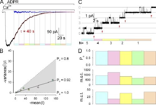 Figure 2. The rundown of TRPM2 currents in excised patches reflects a progressive decline in the number of active channels. (A) Macroscopic TRPM2 current (I; black trace) activated in an inside-out patch by exposure to 32 µM ADPR and 125 µM Ca2+ (bars). Red line is a single-exponential fit to the time course of current rundown, which was subtracted from the current trace to obtain the time course of gating noise (Î; blue trace). Vertical gray lines and colored bars identify consecutive time windows over which the mean of I and the variance of Î were calculated. (B) Plot of −σ2(Î)/i as a function of −m(I) (colored circles), calculated for the segments of time shown in A. The solid black line was obtained by linear regression through the data and corresponds to a Po of 0.93. Gray shaded area identifies the region corresponding to Po values >0.8. (C) Current from five TRPM2 channels recorded in the continuous presence of 398 µM Ca2+ plus 32 µM ADPR. Red arrows mark the time points of irreversible inactivation of the individual channels. Colored bars identify time windows with constant N (between two red arrows). (D) Stability plots of Po, mean open time (m.o.t.), and mean closed time (m.c.t.) for the five individual time windows with constant N, identified by color coding in C. Values were obtained by the cycle-time method (see section 4 in the online supplemental material, available at http://www.jgp.org/cgi/content/full/jgp.200810109/DC1) and are not corrected for missed events because of the filter dead time. Pipette [Ca2+] was ∼4 µM in both A and C.