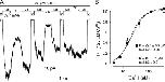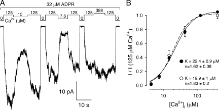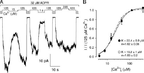 Figure 3. Activation of macroscopic TRPM2 currents requires micromolar [Ca2+]i. (A) Macroscopic TRPM2 current from an inside-out patch superfused with 32 µM ADPR and various test [Ca2+]i, bracketed by exposures to 125 µM Ca2+ (bars). Pipette [Ca2+] was ∼4 µM. (B) Mean currents in test [Ca2+]i, normalized to the mean of the currents in bracketing 125-µM Ca2+ segments, were plotted against [Ca2+]i and fitted to the Hill equation. Pipette [Ca2+] was either ∼4 µM (closed circles and solid fit line) or 1 mM (open circles and dashed fit line). Data are represented as mean ± SEM.