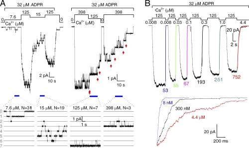 Figure 4. Determination of [Ca2+]i dependence of TRPM2 opening and closing rates. (A) Two representative current traces from patches with smaller numbers of TRPM2 channels superfused with various test [Ca2+]i (bars) in the presence of 32 µM ADPR. Pipette [Ca2+] was ∼4 µM. (left) The number of channels (N) in test segments at low micromolar Ca2+ (blue bars; expanded below) was obtained by linear interpolation of N in bracketing segments at saturating Ca2+. (right) Test segments for [Ca2+]i >40 µM were defined as the time periods between two occurrences of irreversible channel closure (red arrows). Within such segments (blue bars; expanded below) Po approached unity and N was given by the maximum current level. (B) Closing rate at various submicromolar [Ca2+]i was studied in a macropatch; in the presence of 32 µM ADPR TRPM2 channels were alternately exposed to 125 µM Ca2+ and various submicromolar test [Ca2+] (bars); pipette [Ca2+] was ∼4 µM. Current decay time courses in various test [Ca2+]i were fitted by single exponentials (colored smooth lines and time constants [in milliseconds]); those in 8 nM (blue), 300 nM (black), and 4.4 µM Ca2+ (red) are shown below at an expanded time scale. Note the complete lack of reopening events in 8 and 300 nM Ca2+; in 4.4 µM Ca2+ opening rate is still far smaller than closing rate as witnessed by the small remaining steady-state current.