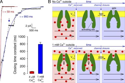 Figure 6. Closure of open channels is slowed by millimolar extracellular Ca2+. (A) Representative time courses of macroscopic current decay upon sudden removal of intracellular Ca2+, with ∼4 µM (left trace) and 1 mM (right trace) free Ca2+ in the pipette solution. Smooth lines are single-exponential fits, with time constants shown. Inset shows mean ± SEM decay time constants for the above two conditions. (B) Cartoon interpretation of channel closing kinetics when intracellular Ca2+ is washed away. (top) In the absence of extracellular Ca2+ the activating sites rapidly lose Ca2+ yielding unliganded channels that close fast (Fig. 5 D, solid arrow). (bottom) In the presence of extracellular Ca2+ the activating sites, which are located in a deep vestibule near the pore entrance, remain liganded because of Ca2+ ions entering through the open pore. Thus, channels close at the slow rate characteristic of fully liganded channels (Fig. 5 D, dotted arrow). Once channels have closed, the activating sites, which are located intracellularly of the gate, are cut away from Ca2+, hence channels remain shut. Note a few occasional reopening events in the right current trace in A, which typically follow brief closures (e.g., blue arrow), suggesting that some fraction of very brief closed events is too short to allow dissociation of Ca2+ from the activating sites. Such occasional reopenings might explain why in the presence of 1 mM of extracellular Ca2+ and 4.4 µM [Ca2+]i the macroscopic current relaxations yield a slightly smaller estimate of closing rate than the steady-state data (Fig. 5 C, white circle vs. diamond for 4.4 µM [Ca2+]i).