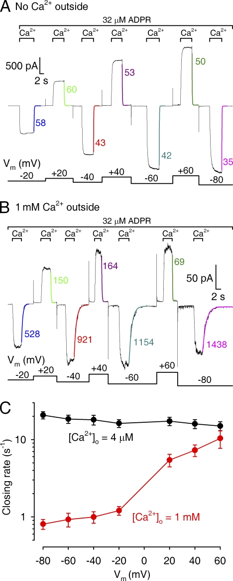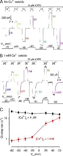Figure 7. Depolarization removes the gating effect of extracellular Ca2+ by preventing Ca2+ influx through the open pore. (A and B) In the presence of 32 µM ADPR macroscopic TRPM2 currents at various test potentials (bars below traces) were activated by exposure to 125 µM of intracellular Ca2+ and closed by its sudden removal. Colored smooth lines are fitted single exponentials and time constants are in milliseconds. Pipette [Ca2+] was ∼4 µM in A and 1 mM in B. (C) Closing rates (mean ± SEM) in zero [Ca2+]i and ∼4 µM (black circles) or 1 mM (red circles)of free Ca2+ in the pipette solution, obtained as the reciprocals of current decay time constants (see A and B, respectively), are plotted against membrane potential.