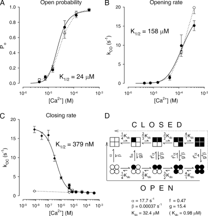 Figure 5. [Ca2+]i dependence of TRPM2 single-channel gating parameters is well described by the MWC model. (A–C) Steady-state (mean ± SEM) open probabilities (Po; A), opening rates (kCO; B), and closing rates (kOC; C) of single TRPM2 channels at ≥4.4 µM Ca2+ are plotted (circles) as a function of [Ca2+]i. In C, diamonds represent closing rates at ≤4.4 µM Ca2+ determined from macroscopic current decay time courses. Pipette [Ca2+] was either ∼4 µM (closed circles) or 1 mM (open circles and dotted lines). Solid black lines illustrate the fit of the data at low extracellular Ca2+ (closed circles) by the scheme in D. (D) MWC model with four Ca2+-binding sites (1 site/subunit). Squares represent closed and circles represent open channel subunits; filled black symbols represent subunits with Ca2+ bound. Solid and dotted arrow indicate the pathways of channel closure upon rapid removal of intracellular Ca2+ in the absence and presence, respectively, of extracellular Ca2+.