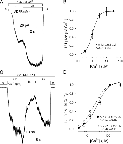 Figure 8. Apparent affinities for TRPM2 activation by intracellular Ca2+ and ADPR are not altered by replacing intracellular Na+ with K+. (A) Macroscopic TRPM2 current elicited in an inside-out patch bathed in a potassium gluconate–based solution by rapid sequential exposure to 1 and 32 µM [ADPR] (bar) in the presence of 125 µM Ca2+. Pipette [Ca2+] was ∼4 µM. (B) Normalized dose-response curve for current activation by ADPR in potassium gluconate solution containing 125 µM free Ca2+ (closed circles) and a fit by the Hill equation (solid line). (C) Macroscopic TRPM2 current from an inside-out patch superfused with potassium gluconate solution and 32 µM ADPR; exposure to ∼15 µM [Ca2+]i was bracketed by exposures to 125 µM Ca2+ (bars). Pipette [Ca2+] was ∼4 µM. (D) Dose-response curve for activation by [Ca2+]i in potassium gluconate solution containing 32 µM ADPR. Mean currents in test [Ca2+]i, normalized to the mean of the currents in bracketing 125-µM Ca2+ segments, were plotted against [Ca2+]i and fitted to the Hill equation. Pipette [Ca2+] was either ∼4 µM (closed circles and solid fit line) or 1 mM (open circles and dashed fit line). (B and D) Data are represented as mean ± SEM.