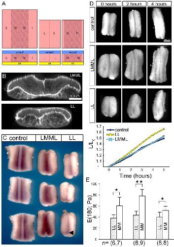 Fig. 3. Mechanics of paraxial-medial and paraxial-lateral tissues.(A) Schematic diagram of explants carrying complete sets of paraxial tissues (lateral-medial-medial-lateral or LMML) and those carrying only paraxial lateral tissues (lateral-lateral or LL) of the dorsal axis. (B) Fibronectin fibril localization in transverse sections of LMML and LL explants shows the location of paraxial mesoderm outlined by fibronectin. (C) A view of XmyoD expression through the endodermal face of explants reveals a distinct boundary between paraxial-medial (XmyoD expressing) and paraxial-lateral (non-expressing) tissues of control dorsal isolates and LMML explants. XmyoD is absent from most of the length of LL explants that can occasionally express a small `wedge' of XmyoD in their most posterior third (arrowhead). All explants are positioned so that anterior is at the top of the panel. (D) Frames and explant lengths over time from a single representative time-lapse (n=6) demonstrate that LMML and LL explants elongate to the same degree as control explants. (E) The stiffness of LL and MM isolates show that MM explants are significantly more stiff than LL explants. *P<0.05; **P<0.01.