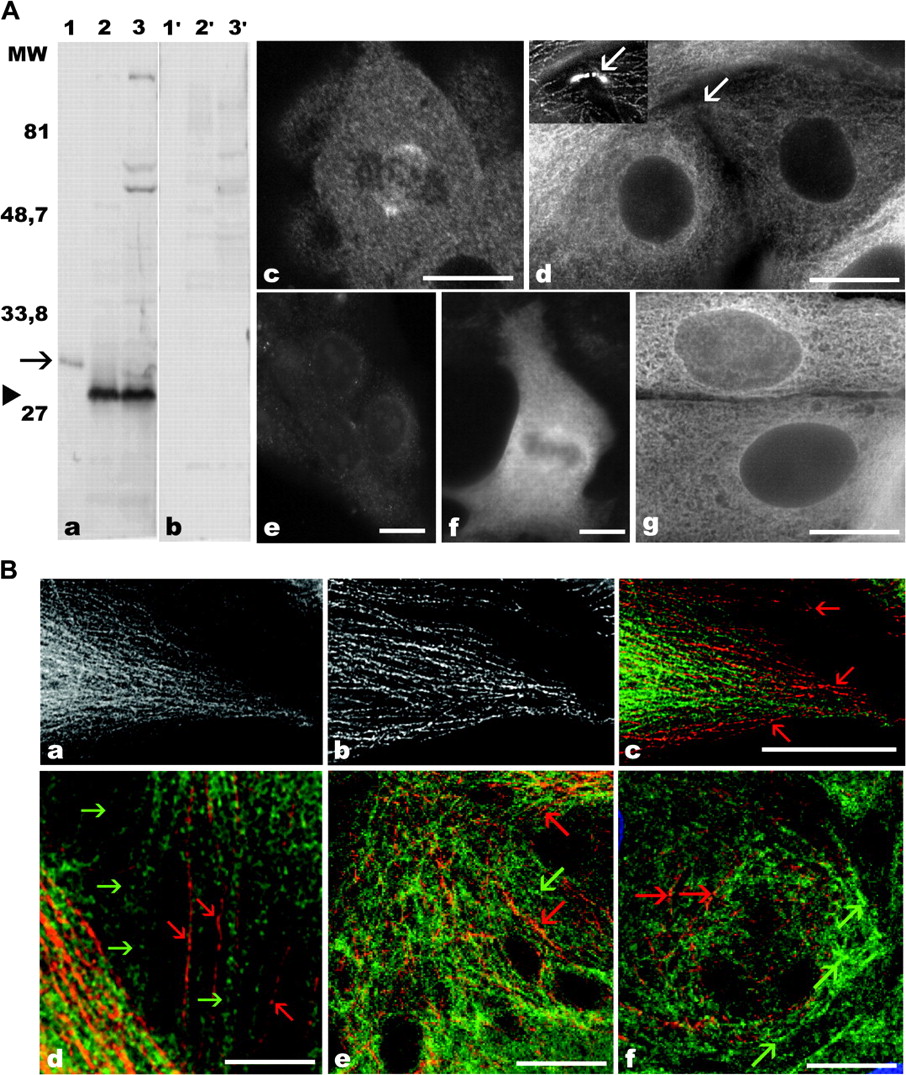Fig. 1. TCTP and MTs form similar, but not identical, networks in XL2 cells. ( A ) Western blotting showing specificity of the serum used to detect Xenopus laevis TCTP (a). Lanes: 1 and 1’ recombinant His-TCTP; 2 and 2’ XL2 cells extract; 3 and 3’ CSF extract made of Xenopus ovulated MII oocytes. Preimmune serum (b) used in 1:5000 concentration, the same as the immune serum shown in (a) delivers virtually no background. Therefore, we show here a western blot with more concentrated (1:1000) preimmune serum (b) showing only traces of non-specific bands. Immunofluorescence localization of endogenous TCTP (c and d in the top panel) and Myc-TCTP localization (f and g in the bottom panel) following expression in XL2 cells. In mitotic cells, TCTP localizes to the division spindle as well as it forms a granular network in the cytoplasm (c; a single confocal section through metaphase cell). In interphase cells, TCTP forms dense cytoplasmic network similar to MTs (d). Midbody stained with anti-tubulin (white arrow in the inset) is, however, free of TCTP (white arrow in d). Control staining with preimmune serum (e) shows the specificity of the immunofluorescence staining with the serum. Preimmune serum gives a faint background with no fibrous staining. Myc-TCTP was expressed and localized by immunofluorescence using anti-Myc antibody in XL2 cells (f and g; bottom panel). In mitotic cells, Myc-TCTP accumulates in the spindle (f; here in metaphase). In interphase cells (g), Myc-TCTP forms a fibrous MT-like network. Non-transfected cells were entirely negative for anti-Myc antibody as shown in Figure 2C (negative cells around the central positive one). Bars = 20 μm. ( B ) Endogenous TCTP was visualized by immunofluorescence (a) in parallel with MTs (b) using monoclonal α-tubulin. The merged image (c) shows differences between TCTP and MTs fibers localization in the most flattened cell parts. Red arrows point out MTs that do not correspond to TCTP fibers and appear red. Bars in a–c = 20 μm. Higher magnifications of cells illustrate distinct TCTP (green) and MT (red) fibers (d–f). Green arrows show examples of TCTP fibers not overlapping with MTs and red arrows point out MTs free of TCTP. In colchicine-treated cells (e and f), MTs become less dense and the lack of colocalization between MTs and TCTP fibers is visible even in the cell body and not only in their most flattened parts. Note that most green TCTP fibers have no equivalent in MTs (green arrows in e and f). Inversely, most, if not all, MTs are free of TCTP (red arrows in e and f). Bars: d = 10 μm, e = 20 μm, f = 15 μm. All cells in (A) and (B) were fixed with methanol–formaldehyde.