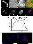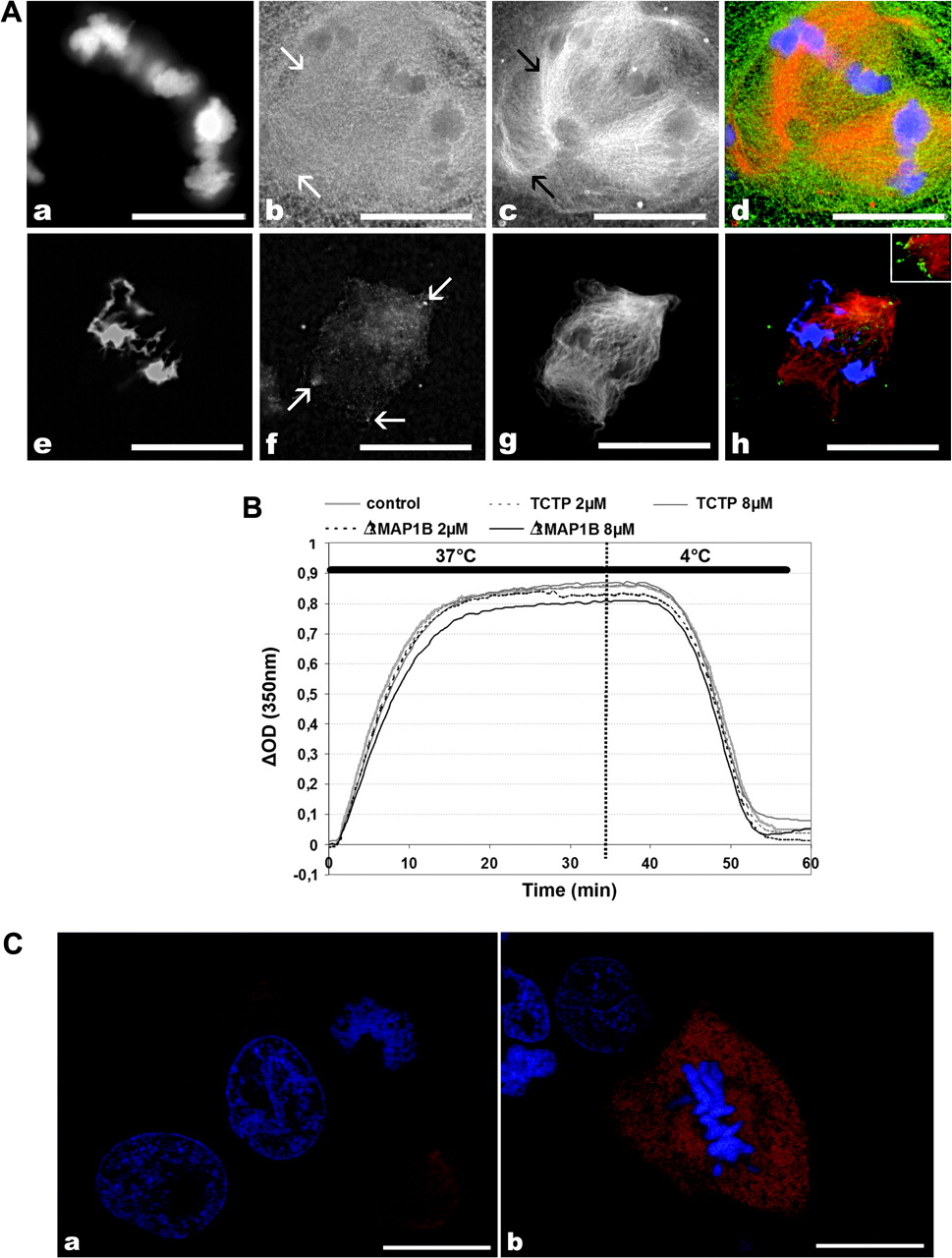 Fig. 2. TCTP is abundant in the mitotic spindle, but it is not associated with spindle MTs. ( A ) Mitotic spindles were assembled in the CSF extract following addition of sperm heads and rhodamine tubulin. Samples were frozen in liquid nitrogen, post-fixed in cold methanol (crude spindles) and stained for DNA (a), TCTP (b) and MTs (c; merged image in d). Spindles show high, but not fibrous, TCTP staining and a granular network of TCTP in the adjacent cytoplasm that does not colocalize to MTs (especially visible in corners of b–d). Two examples of MT fibers (black arrows in c) that do not correspond to any TCTP fibers (white arrows in b) are shown. In parallel, spindles assembled in the extract were purified on glycerol cushion, fixed (purified spindles) and processed for DNA staining (e), TCTP immunofluorescence (f) and MTs labeling with rhodamine tubulin (g; merged image in h). The majority of TCTP staining disappeared from purified spindles and discrete fluorescent dots of TCTP remained on the spindle poles (white arrows in f). Merged image of DNA, TCTP and rhodamine tubulin (h) shows clear red staining of spindle MTs with yellow dots on its poles indicating that only in these areas the colocalization of TCTP and tubulin is detected. Inset in h shows details of a merged image of another spindle pole with TCTP remnants in higher magnification. Bars = 20 μm. ( B ) Either 6xHis- Xl TCTP or 6xHis- Xl TCTP ΔMAP1B does not modify assembly/disassembly of MTs in vitro . Tubulin alone (control) or mixed with two concentrations of recombinant wild-type TCTP (TCTP 2 and 8 μM) or ΔMAP1B deletion mutant (ΔMAP1B 2 and 8 μM) was incubated at 37°C (0–35 min) or 4°C (35–60 min) and optical density of samples was measured at 350 nm light wave to follow assembly (0–35 min) and disassembly (35–60 min) of MTs. All curves are very similar indicating that neither 6xHis- Xl TCTP nor 6xHis- Xl TCTP ΔMAP1B modifies MTs dynamics. ( C ) MAP1 domain does not influence localization of TCTP. Myc-TCTP ΔMAP1B localizes to mitotic spindles (b; here in metaphase) after expression in XL2 cells and forms a network in the cytoplasm of both mitotic (b) and interphasic cells (a). XL2 cells were transfected with an appropriate vector and were fixed and processed for anti-Myc immunofluorescence. Single confocal sections of DNA (blue) and anti-Myc immunofluorescence (red) in an interphase (a) and metaphase (b) cells are shown. Note that peripheral cells that do not express Myc-TCTP are negative, while stained with anti-Myc antibody providing the control of the specificity of anti-Myc detection for the exogenous protein. Bars = 20 μm.