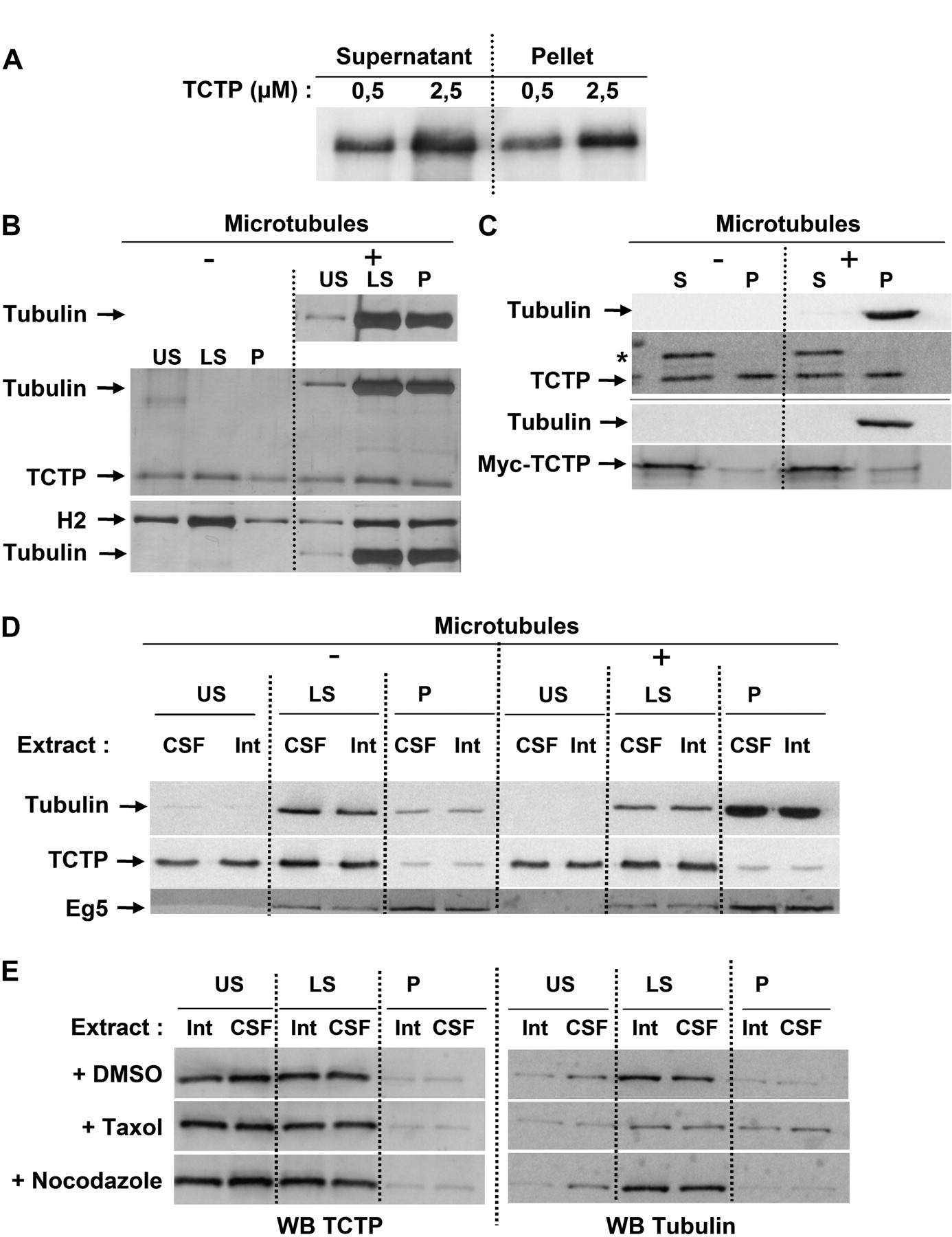 Translationally controlled tumor-associated protein (TCTP) is a ubiquitous and highly conserved protein implicated in cancers. Here, we demonstrate that interactions of TCTP with microtubules (MTs) are functionally important but indirect, and we reveal novel interaction of TCTP with the actin cytoskeleton. Firstly, immunofluorescence in Xenopus XL2 cells revealed cytoplasmic fibers stained with TCTP but not with tubulin antibodies, as well as MTs free of TCTP. Furthermore, TCTP localized to a subset of actin-rich fibers in migrating cells. Secondly, Xenopus laevis TCTP did not affect in vitro assembly/disassembly of MTs and lacked MT-binding affinity both in pull-down assays and in cell-free extracts. Although TCTP also failed to bind to purified filamentous actin (F-actin), it was associated with microfilaments in cell-free extracts. Thirdly, TCTP concentrated in mitotic spindle did not colocalize with MTs and was easily dissociated from these structures except at the poles. Finally, RNA interference knockdown of TCTP in XL2 and HeLa cells provoked drastic, MT-dependent shape change. These data show that although TCTP interacts with MTs, it does not behave as classic MT-associated protein. Our evidence for an association of TCTP with F-actin structures, and for an involvement in cell shape regulation, implicates this protein in integrating cytoskeletal interactions both in interphase and mitosis providing a new avenue to fully understand the role of TCTP.
