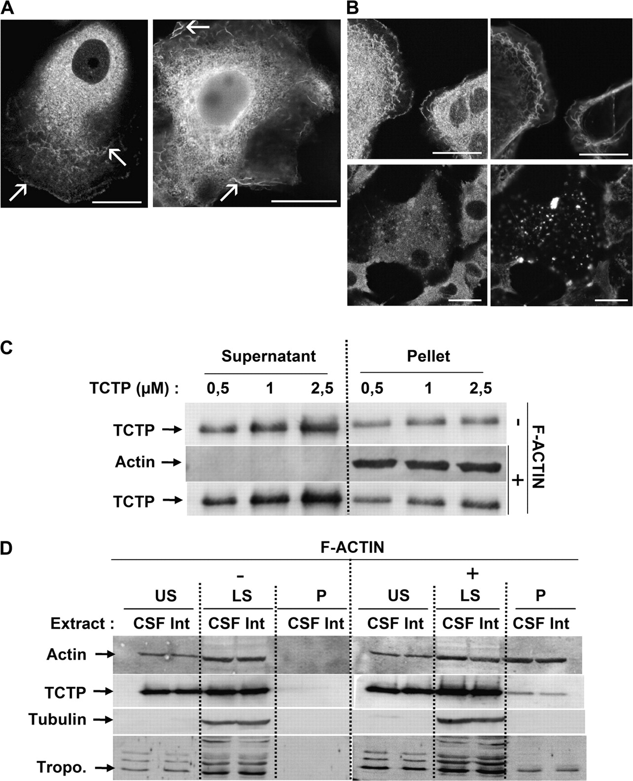 Fig. 4. TCTP colocalizes with F-actin in XL2 cells and has an affinity for F-actin fibers in a cosedimentation assay with cell-free extracts. ( A ) TCTP forms curly fibers at the cell border in flattened and migrating XL2 cells (fixed with paraformaldehyde). Endogenous (left) and Myc-TCTP (right) shows distinct curly fibers at the cell border (arrows). ( B ) TCTP partially colocalizes with F-actin. Double staining for TCTP (left) and F-actin (right) in control (upper row) and cytochalasin D-treated (bottom row) cells fixed with paraformaldehyde. Note clear colocalization of TCTP and F-actin on the cell's border in control cells. Cytochalasin D induces actin-rich foci (bottom, right) in which TCTP accumulates preferentially (bottom, left). TCTP (left) was immunolocalized, whereas F-actin was stained with phalloidin rhodamin (right). Peripheral fibers in control cells in which TCTP and actin colocalize disappear after cytochalasin treatment. Bars = 20 μm. ( C ) Recombinant 6xHis- Xl TCTP is not enriched in F-actin-containing pellet in vitro . Increasing concentrations (0.5, 1, 2.5 μM) of recombinant TCTP alone (−) were incubated in the buffer without F-actin and centrifuged (top row). Supernatants contain growing amounts of TCTP, while a similar amount of TCTP is found in the pellet. When F-actin is added (+) to the mixture, it is found exclusively in the pellets (middle row), whereas TCTP remains in unchanged proportions in supernatants and pellets in the same samples (+; bottom row) as in the absence of F-actin (top row). ( D ) Endogenous Xl TCTP is enriched in the pellet containing F-actin incubated both with CSF and interphase extracts similarly as endogenous tropomyosin known to associate with F-actin. F-actin was not added (−; left) or added (+; right) to CSF and interphase extracts. Endogenous actin is detected in upper (US) and lower (LS) supernatants (both in − and +). Exogenous F-actin is detected in the pellet (P) in F-actin-supplemented extracts (top row; rightmost). TCTP is almost absent in the pellet (P) in the absence of exogenous F-actin (second row, − P), but it appears in the pellet (P) in the presence of exogenous F-actin (second row, + P). Tubulin western blot was used as a negative control (third row). Tubulin is detected largely in the LS both in the absence and presence of exogenous F-actin (third row). Tropomyosin, used here as a positive control (bottom row), accumulates in the pellet (P) only in the presence of exogenous F-actin (bottom row, + P, rightmost). Note that non-specific bands recognized by anti-tropomyosin antibody on the western blot are not present in the pellet confirming the specificity of the assay (compare + P with + and − LS and US lanes).