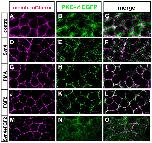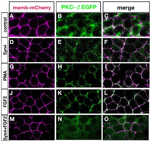 Fig. 5. Membrane translocation of PKCδ by FGF is inhibited by Syn4. Xenopus animal caps analysed by confocal microscopy after injection/treatment as indicated. (A-C) Control animal cap shows cytoplasmic localisation of PKCδ. (D-F) Animal caps injected with Syn4 mRNA. PKCδ shows cytoplasmic distribution. (G-L) Phorbol ester (PMA; G-I) or FGF2 (J-L) triggers the translocation of PKCδ into the membrane. (M-O) Syn4 inhibits the translocation of PKCδ activated by FGF2. |