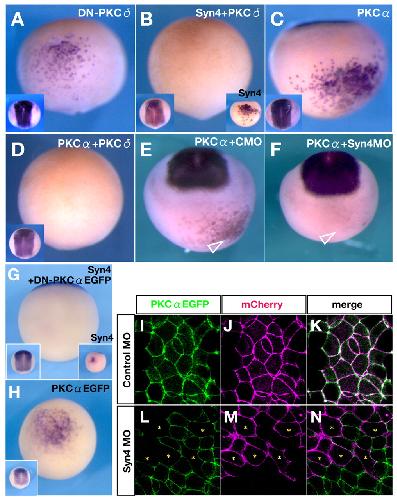 Fig. 6. Inhibition of PKCδ or activation of PKCα is essential for neural induction by Syn4. (A-H) Sox2 expression in Xenopus embryos injected, as indicated, into A4 blastomeres at the 32-cell stage. (A-D) Ventral view, dorsal to the top. Insets on left show a dorsal view. (A) Dominant-negative Xenopus PKCδ (DN-PKCδ). Note the ectopic Sox2 induction (48%, n=71). (B) Co-injection of Syn4 and Xenopus full-length PKCδ mRNAs represses the ectopic expression of Sox2 (18%, n=91). Inset on the right shows the ventral ectopic Sox2 expression induced by Syn4 mRNA (95%, n=85). (C) Human (h) PKCα mRNA can induce ectopic Sox2 expression (68%, n=92). (D) Co-injection of hPKCα and PKCδ mRNAs shows inhibition of neural induction (20%, n=124). (E) Co-injection of hPKCα with control MO (CMO). Arrowhead indicates the ectopic expression of Sox2 (70%, n=68). (F) Co-injection of hPKCα mRNA with Syn4 MO. Sox2 induction is not observed in the injected cells (arrowhead) (23%, n=51). (G) Co-injection of Syn4 and a dominant-negative form of PKCα (DN-PKCα-EGFP) inhibits Sox2 expression (15%, n=51). (H) Injection of PKCα-EGFP mRNA. Ectopic induction of Sox2 is similar to that upon PKCα injection, showing that EGFP does not affect the activity of the fusion protein. (I-N) Confocal images of animal caps injected as indicated. PKCα-EGFP mRNA was injected into both blastomeres at the 2-cell stage. At the 16-cell stage, Syn4 or control MO and membrane Cherry mRNA were injected into one blastomere. (I-K) PKCα-EGFP spontaneously localises at the membrane, colocalising with membrane Cherry. (L-N) The distribution of Syn4 MO can be identified by the fluorescence of mCherry. Note that cells with a high level of Syn4 MO (asterisks) exhibit a low level of PKCα-EGFP in the membrane. |