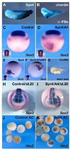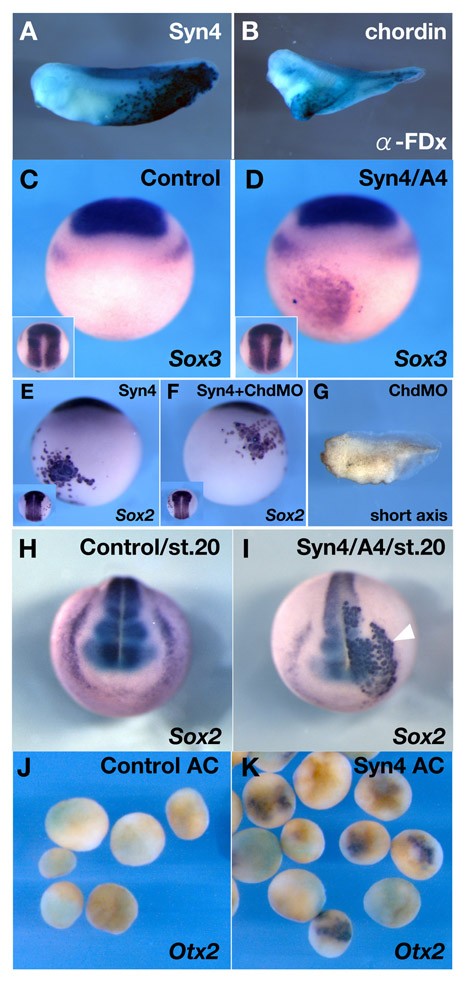 Fig. S2. Syn4 has a neuralising activity that does not depend on BMP inhibition. (A,B) Formation of secondary axis. (A) Embryos were injected in ventral blastomeres with Syn4 (A) or chordin (B) mRNA and the lineage tracer β-galactosidase. Note the secondary axis induced by chordin injection; but no secondary axis was observed in Syn4-injected embryos. (C,D) Sox3 expression in stage 14 embryos, dorsal to the top. Inset shows the dorsal side. (C) Control expression of Sox3. (D) Embryo was injected with Syn4 mRNA into A4 blastomeres and the expression of Sox3 analyzed. Note the ectopic induction of Sox3 in ventral epidermis (89% induction, n=49). (E-G) Neuralisation by Syn4 does not require chordin. (E) Ventral view of an embryo injected with Syn4 mRNA. Note the ectopic Sox2 expression (91%, n=12). (F) Ventral view of embryo co-injected with Syn4 mRNA and chordin MO. There was no effect on the ectopic induction of Sox2 (89%, n=37). (G) Embryo injected with chordin MO to show the expected ventralised phenotype (100%, n=9). (H,I) Sox2 expression analysed in stage 20 embryos. Anterior view, dorsal to the top. (H) Control. (I) Embryo injected in A4 with Syn4 mRNA. Note the strong ectopic induction of Sox2. (J,K) Animal caps showing induction of Otx2 by Syn4 expression (K); no induction was observed in control animal caps (J). |