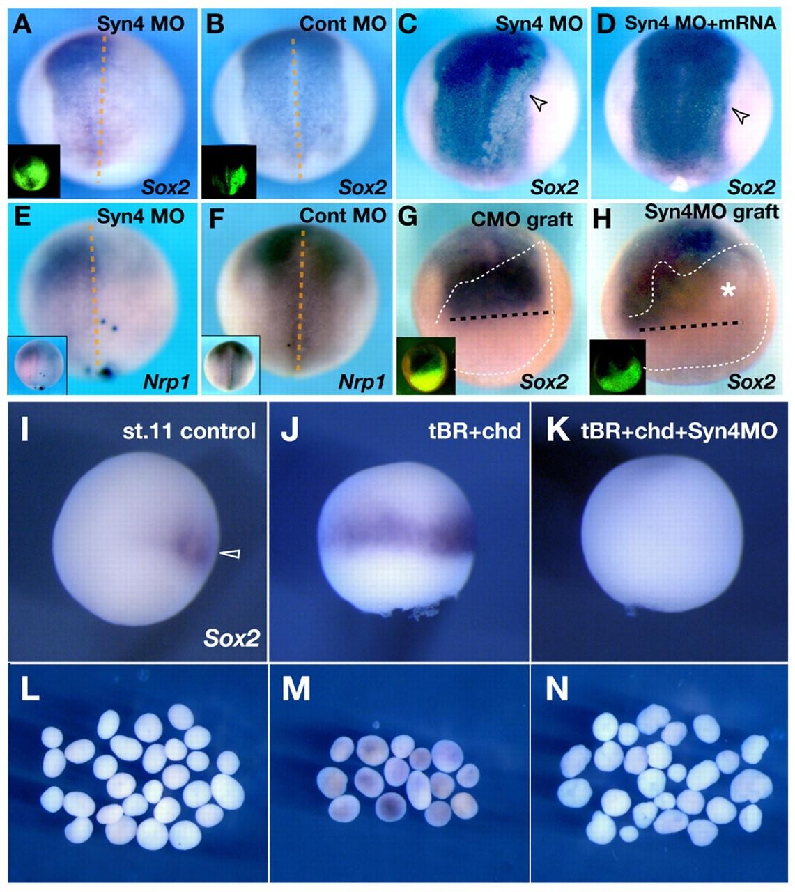 Fig. 2. Syn4 is required for neural induction.Sox2 and Nrp1 expression was analysed by whole-mount in situ hybridisation. (A-H) MO-injected samples analysed at stage 14. The lineage tracer in shown in the insets. (A) Syn4 MO injected in one animal blastomere of an 8-cell stage Xenopus embryo. Note the inhibition of Sox2 expression on the injected (right-hand) side (60%, n=45). (B) Similar to A, but injection with control MO. No effect on Sox2 expression is observed (0%, n=57). (C) Syn4 MO was injected into the dorsal animal blastomere (A1) at the 32-cell stage. Note the inhibition of Sox2 expression in the injected region (arrowhead) (55%, n=50). (D) Syn4 mRNA mutated in the MO sequence region was co-injected with Syn4 MO into the A1 blastomere of a 32-cell stage embryo. Note the rescue of the expression of Sox2 (8%, n=66). (E) Syn4 MO injected into one animal blastomere of an 8-cell stage embryo. Note the inhibition of Nrp1 expression on the injected side (95%, n=42). (F) No inhibition is observed with the control MO (0%, n=21). (G) Control-morpholino-injected ectoderm was grafted into an uninjected embryo. Sox2 expression is normal (100%, n=10). Black dashed line indicates the anterior border of Sox2 expression. White dashed line outlines the graft. Inset shows the position of the graft by its fluorescence. (H) Syn4 MO-injected ectoderm was grafted into an uninjected embryo. Sox2 expression is absent from the grafted area (asterisk; 70%, n=10). Inset shows the position of the graft by its fluorescence. (I-N) Analysis of Sox2 expression at stage 11. (I) Expression of Sox2 is initially observed in the dorsal region (arrowhead). (J) Expansion of Sox2 expression by BMP inhibition [BMP antagonists: truncated BMP receptor (tBR) and chordin (chd) mRNA]. (K) Early induction of Sox2 was eliminated by co-injection of Syn4 MO (69%, n=50). (L) Control animal caps, showing no expression of Sox2. (M) Animal caps taken from embryos injected as in J, showing weak upregulation of Sox2. (N) Animal caps taken from embryos as in K. Co-injection of Syn4 MO blocks Sox2 induction. |