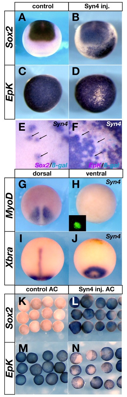 Fig. 3. Syn4 overexpression neuralises ectoderm. (A-D) Anterior view, dorsal to the top (A,B); ventral view (C,D). (A,C) 500 pg of NLS-β-gal mRNA was injected into the A4 blastomere of a 32-cell stage Xenopus embryo, and the expression of Sox2 (A) and epidermal keratin (Epk) (C) was analysed by in situ hybridisation. (B,D) 1 ng of Syn4 mRNA was injected into the A4 blastomere of a 32-cell stage embryo, and the expression of Sox2 (C; 96% of induction, n=87) and Epk (D; 80% of inhibition, n=70) was analysed. (E,F) Higher magnification of embryos injected as in B,D. Arrows indicate nuclei stained with X-Gal (blue). (G-J) Dorsal (G,I) and ventral (H,J) views of embryos injected as in B with Syn4 mRNA. No ectopic expression of MyoD (0%) or Xbra (0%) was observed. Inset in H shows injected fluorescein. (K-N) Animal cap (AC) assay for Sox2 (K,L) or Epk (M,N) expression. (K,M) Control caps express only Epk. (L,N) Syn4 mRNA-injected animal caps express Sox2 and downregulate Epk. |