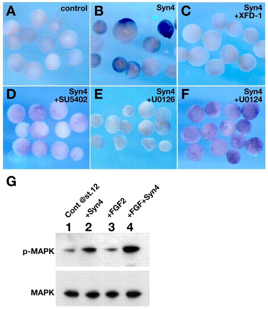 Fig. 4. The FGF/MAPK pathway is required for neural induction by Syn4. (A-F) Sox2 expression analysed by whole-mount in situ hybridisation in Xenopus animal caps. (A) Control caps. No Sox2 expression. (B) Syn4-injected caps express Sox2. (C) Co-injection of Syn4 and a dominant-negative form of FGF receptor 1 (XFD-1) inhibits Sox2 expression. (D) Syn4-injected caps treated with 40μ M SU5402 (in DMSO) do not show Sox2 expression. (E) Syn4-injected caps treated with 80 μM U0126 do not express Sox2. (F) Syn4-injected caps treated with 80 μM U0124 show expression of Sox2.(G) Animal caps were injected as indicated (Cont, control) and samples taken for western blot analysis of MAPK phosphorylation at the equivalent of stage 12. Antibodies against MAPK or phosphorylated MAPK (p-MAPK) can recognise both p42 and p44 as a single band. Each experiment was repeated three times with at least 50 animal caps. |