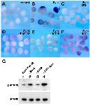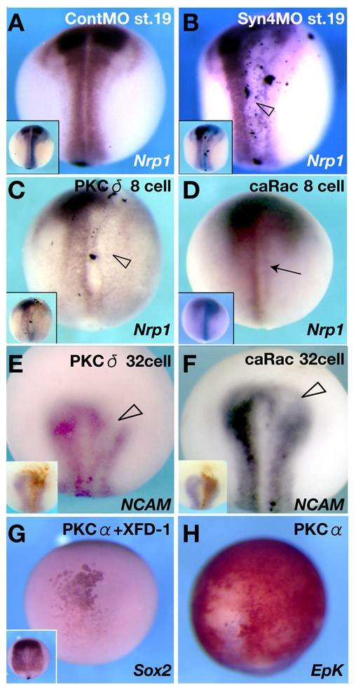 Fig. S1. Syn4/PKC/Rac pathways involved in neural induction. Embryos were injected as indicated into the animal blastomeres of an 8-cell stage embryo or into A1 or A4 of a 32-cell embryo, and the expression of neural or epidermal markers analyzed at stage 19. (A) Control MO injected at the 8-cell stage. Analysis of Nrp1 (0% inhibition, n=18). (B) Syn4 MO injected at the 8-cell stage. Analysis of Nrp1 (96% inhibition, n=27). (C) PKCδ mRNA injected at the 8-cell stage. Analysis of Nrp1 (46% inhibition, n=23). (D) Constitutively active Rac mRNA injected at the 8-cell stage. Analysis of Nrp1 (39% inhibition, n=42). (E) PKCδ mRNA injected at the 32-cell stage. Analysis of NCAM (43% inhibition, n=7). (F) Constitutively active Rac mRNA injected at the 32-cell stage. Analysis of NCAM (32% inhibition, n=25). (G) Sox2 expression of embryo injected with PKCα and a dominant-negative form of FGF receptor (XFD-1). Note that the ectopic induction is not inhibited (58% induction, n=31). (H) Epidermal keratin (Epk) expression after injection of PKCα mRNA into A4 blastomeres. Note the inhibition of epidermis (63% inhibition, n=22). |