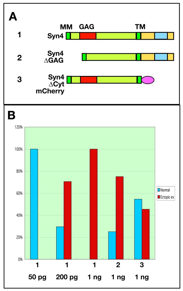 Fig. S3. Analysis of neuralising activity of Syn4. (A) Deletion constructs of Syn4. 1, wild-type Syn4. 2, Syn4δGAG, with deletion of the glycosaminoglycan domain of Syn4. 3, Syn4δCyt-Cherry, with deletion of the intracellular domain of Syn4, which was replaced by the fluorescent protein Cherry. (B) Embryos were injected in A4 with the indicated mRNAs and the expression of Sox2 analyzed. The percentage of embryos showing normal (blue bars) or ectopic (red bars) Sox2 expression. Different concentrations of each construct were tested. |