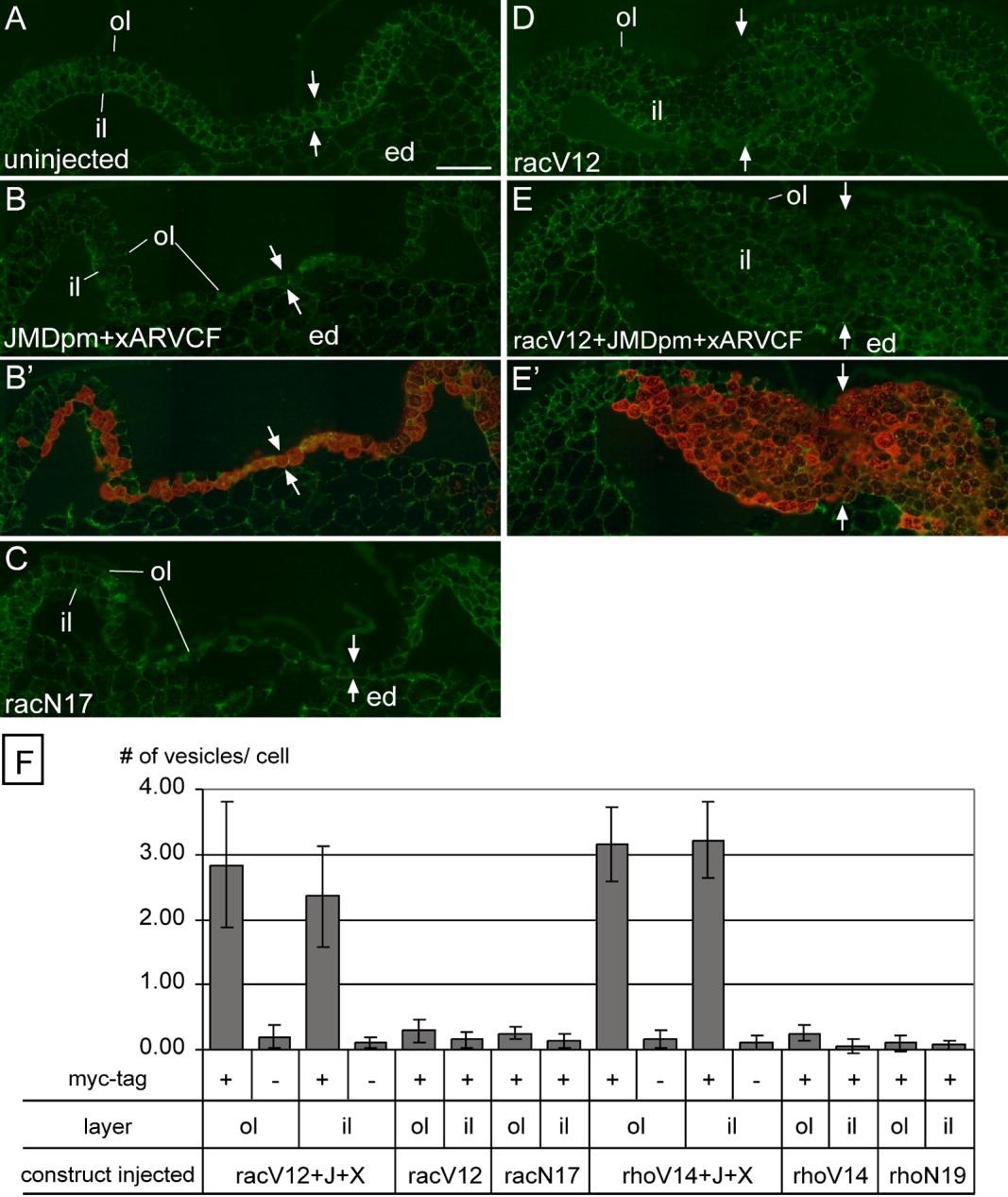 Figure 7. Coexpression of racV12 restores adhesion in JMDpm+xARVCF-expressing cells. Animal caps of injected embryos at early gastrula stage (stage 10.5). A-E: C-cadherin staining. B',E': Overlay of C-cadherin (green) and JMDpm (red) staining. During fixation, the animal cap has collapsed on the endodermal tissue below (ed). Opposing arrows indicate thickness of animal cap. ol, outer layer; il, inner layer. Bar = 100 mu m. A: Uninjected bilayered animal cap. B: JMDpm+xARVCF (1 ng resp. 250 pg/inj.), cells of the inner layer have detached, outer layer is intact. B': JMDpm-positive cells in the outer layer. C: racN17 (200 pg/inj.), cells of the inner layer have detached, outer layer is intact. D: racV12 (25 pg/inj.), cells of the inner layer form a thick cluster. E: Coexpression of racV12, JMDpm, and xARVCF (25 pg, 1 ng resp. 250 pg/inj.). The inner layer forms a thick cluster of adherent cells. E': Thick part of the inner layer consists of JMDpm-positive cells. F: Quantification of intracellular cadherin spots. The number of cadherin-positive spots in the cytoplasm was determined per myc-positive cell. Cells of the outer layer (ol) and cells of the inner layer (il) were evaluated separately. If construct expression resulted in an increase of spots, spots in adjacent myc-negative cells were also counted as control. Error-bars indicate standard deviation.