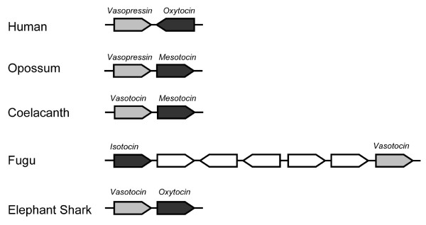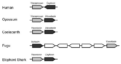 Figure 1. Organization of neurohypophysial hormone-genes in jawed vertebrates. Genes are shown as arrows. Only the neurohypophysial hormone-genes are labeled. The elephant shark genes were sequenced in this study. The arrangements of genes in other vertebrates are mainly from [8]. The neurohypophysial hormone-genes in chicken and Xenopus are arranged like their homologs in coelacanth.