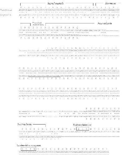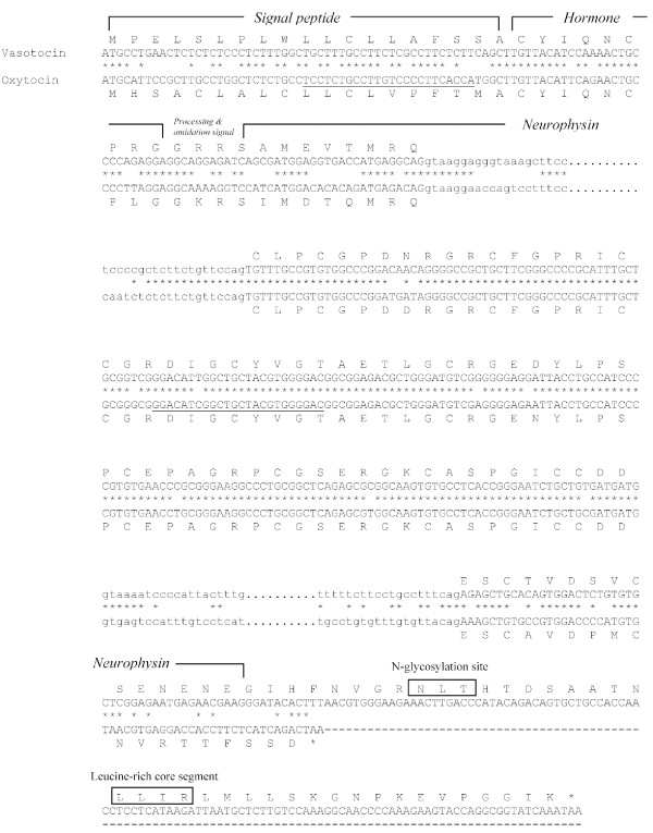 Figure 3. Comparison of nucleotide and deduced amino acid sequences of elephant shark vasotocin and oxytocin genes. Conserved nucleotides are indicated by an asterisk. N-glycosylation sites and Leu-rich core segment in the vasotocin precursor are boxed. Intronic sequences are shown in lower case.