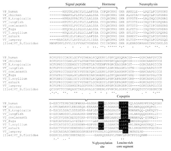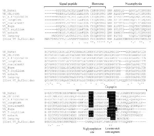 Figure 4. Comparison of amino acid sequences of vasopressin family hormone precursors in vertebrates. The alignment was generated by ClustalX. Amino acid residues conserved in all vertebrates are marked with an asterisk. B. floridae, Branchiostoma floridae; X. tropicalis, Xenopus tropicalis; and T. scyllium, Triakis scyllium. VP, vasopressin and VT, vasotocin. Accession numbers of sequences used in the alignment: NP_000481.2 (human VP), BAA24026.1 (lungfish VT), O42499 (fugu VT), BAD27476.1 (T. scyllium VT) and BAA06669.1 (lamprey VT). Sequences for Xenopus tropicalis and coelacanth were generated in a previous study [8] while sequences for elephant shark (eshark) and amphioxus (B. floridae) were generated in this study.