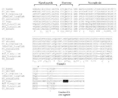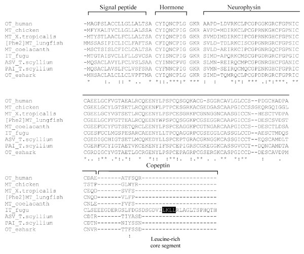 Figure 5. Comparison of amino acid sequences of oxytocin family hormone precursors in vertebrates. The alignment was generated by ClustalX. Amino acid residues conserved in all vertebrates are marked with an asterisk. X. tropicalis, Xenopus tropicalis; and T. scyllium, Triakis scyllium. OT, oxytocin; MT, mesotocin; IT, isotocin; ASV, asvatocin and PAI, phasitocin. Accession numbers of sequences used in the alignment: NP_000906.1 (human OT), BAA24027.1 (lungfish [Phe2]MT), O42493 (fugu IT), BAD27478.1 (T. scyllium phasitocin) and BAD27477.1 (T. scyllium asvatocin). Sequences for Xenopus tropicalis and coelacanth were generated in a previous study [8] while the sequence for elephant shark (eshark) was generated in this study.