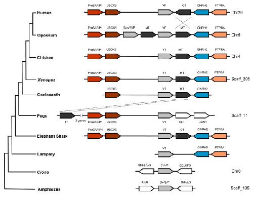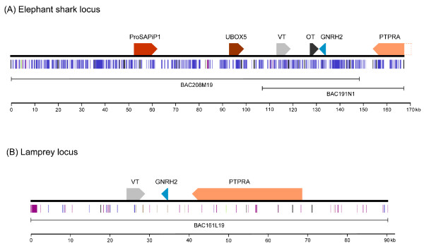 Figure 2. The neurohypophysial gene locus in the elephant shark (A) and Japanese lamprey (B). The BACs used for generating the sequences are shown below. Arrows represent genes and indicate the direction of transcription. Coloured vertical lines represent repetitive sequences. VT, vasotocin gene; OT, oxytocin gene; ProSAPiP1, proline rich synapse associated protein interacting protein 1; UBOX5, U-box domain containing 5; GNRH2, gonadotropin-releasing hormone 2; PTPRA, protein tyrosine phosphatase, receptor type, A.