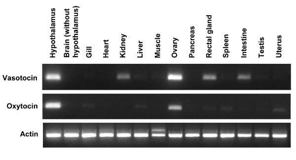 Figure 6. Expression patterns of elephant shark neurohypophysial hormone genes. Expression patterns of the elephant shark vasotocin and oxytocin genes as determined by semi-quantitative RT-PCR. Expression of actin gene was analyzed as a control for the quality of RNA and cDNA.