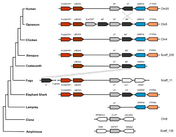 Figure 7. Schematic diagram of neurohypophysial hormone gene loci in chordates. Arrows represent genes and indicate the orientation of transcription. ProSAPiP1, ProSAP-interacting protein 1 gene; UBOX5, U-box domain containing 5; [Lys8]VP, lysipressin gene; VT, vasotocin gene; MT, mesotocin gene; OT, oxytocin gene; IT, isotocin gene, GNRH2, gonadotropin-releasing hormone 2; PTPRA, protein tyrosine phosphatase receptor type A gene; CL1, chemokine CL1 gene; UGNT, UDP glucuronic acid/N-acetylglucosamine dual transporter gene; RNR, ribonucleotide reductase M2 polypeptide; St8sia2, alpha-2,8-sialyltransferase; RPS6KA3, ribosomal protein S6 kinase 90kDa polypeptide3; Ci-VP, Ciona-vasopressin; and CELSR3, cadherin EGF LAG seven-pass G-type receptor3.