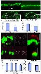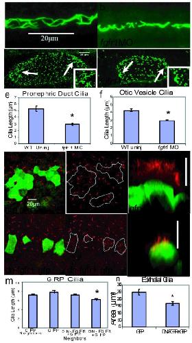 Figure 3. Cilia length in pronephric ducts, otic vesicles, gastrocoel roof plate epithelia and mucociliary epithelia is controlled by FGF signaling(a-b) Pronephric duct cilia were shorter and disorganized in fgfr1 morphants (p<4.24×10-4; 528 cilia; 10 embryos,) compared to WT (517 cilia; 10 embryos) 26 SS embryos. (c-d) Otic vesicle tethering cilia (arrows, and inset) were shorter (p< 1.10e-07) in fgfr1 morphants (325 cilia; 10 embryos) compared to WT embryos (322 cilia; 8 embryos) at 24 hpf. (g-j, m). GRP cilia in Xenopus embryos were normal length in cells expressing GFP alone (green cells in g, outlined in h; 316 cilia 18 embryos, p<0.11), neighboring cells (outside boundaries in h; 653, 18 embryos), and cells neighboring DN-FGFR+GFP expression (outside boundaries in j; 652 cilia 15 embryos, p<0.99). In contrast, GRP cilia were shorter in cells expressing DN-FGFR+GFP (i, inside boundaries in j; 155 cilia, 15 embryos) compared to neighboring cells (p<6.1e-03) and cells expressing GFP alone (p<2.7e-03). (k, l) Z plane rendering of mucociliary epithelia (scale bar 20 um), showing shorter cilia in cells expressing DN-FGFR+GFP (13 cells, 7 embryos) compared to controls expressing GFP alone (14 cells, 4 embryos). (n) Multicilia area is reduced in cells expressing DN-FGFR+GFP (p<0.019). Error bars are s.e.m.
