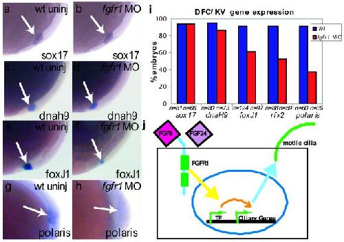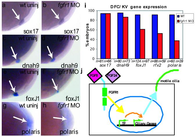 Figure 4. FGF signaling controls ciliogenic genes in DFC/KV cells(a, b) sox17 expression in DFC/KV (and endoderm cells in a different focal plane) in 90% epiboly embryos was normal in fgfr1 morphants and WT embryos. (c, d) Expression of dnah9 in 95 % epiboly embryos was normal in fgfr1 morphants and WT embryos. (e, f) In contrast, foxJ1 was down-regulated in fgfr1 morphants versus WT embryos at 90% epiboly. (g, h) Similarly, polaris was down-regulated in fgfr1 morphants versus WT embryos at tailbud stage. (i) Comparison of percentage of embryos with WT expression levels of each gene indicated. (j) Proposed mechanism by which FGF signaling controls length of motile cilia: FGF ligands bind to FGFR1 activating downstream transcription factors (TF) including foxj1 and rfx2, these TF activate IFT genes (e.g. polaris) to maintain motile cilia length on epithelial cells.