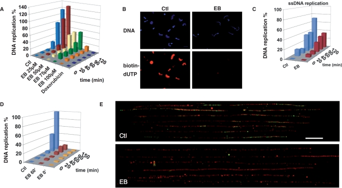 Figure 1. Intercalation inhibits initiation of chromosomal DNA replication. (A) Replication time-courses in the control extract or in the presence of ethidium bromide or doxorubicin at indicated concentrations. (B) Replication was assessed by immunofluorescence of incorporated biotin-dUTP in the absence (Ctl) or presence of 100 μM ethidium (EB), the 45 min time-point is shown. (C) Replication time-course of ssDNA (M13 bacteriophage) in the absence or presence of 100 μM ethidium bromide. (D) Replication time-course of dsDNA in the absence or presence of 100 μM ethidium, added either at the beginning (EB 0′) or at 60 min. (EB 60′). (E) Sperm nuclei were incubated in the presence of Br-dUTP without (Ctl) or with 100 μM ethidium bromide (EB). At 75 min DNA was combed and single fibre analysis was performed. Images represent examples of DNA fibres; ssDNA in red, Br-dUTP in green, bar 10 μm.