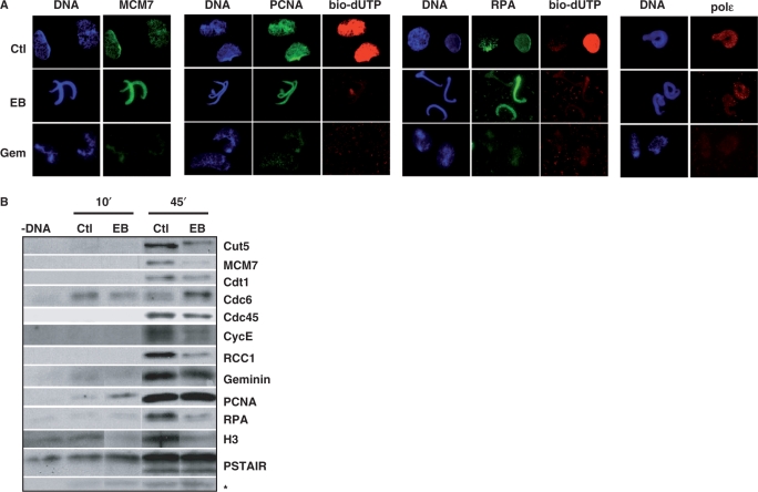 Figure 5. Pre-RC and initiation complexes are present on the chromatin, despite the absence of nuclear membrane and lamina, but replication does not initiate. (A) Assessment by immunofluorescence of the presence of pre-RC (MCM7) and initiation (PCNA, RPA and polymerase ε) complex proteins on the chromatin at 60 min in control (Ctl) extracts or extracts with 100 μM ethidium bromide (EB) or 100 nM recombinant geminin (Gem). DNA replication was monitored by biotin-dUTP incorporation (bio-dUTP). (B) Chromatin was purified from replicating nuclei incubated in the absence (Ctl) or presence of 100 μM ethidium (EB) at indicated time-points, and blotted with antibodies against proteins of the pre-RC, pre-IC, Cdk1/2 (PSTAIR, which recognizes Cdk1, upper band, and Cdk2, lower band), Cyclin E, RCC1 and histone H3; *bottom band, loading control (non-specific chromatin protein band recognized by Cdc6 antibody). For clarity, lanes are assembled electronically but all are from a single exposure of one gel.