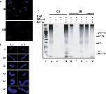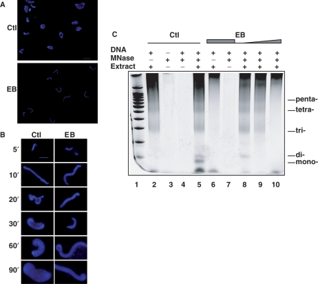 Figure 3. Ethidium inhibits the second phase of chromatin decondensation. (A) Sperm nuclei were incubated for 60 min in control (Ctl) or 100 µM ethidium (EB) treated extracts, and decondensation was monitored by staining DNA with Hoechst 33‱258. (B) Sperm decondensation in the absence (Ctl) or presence of 100 μM ethidium (EB) was monitored by incubating sperm nuclei in IEE, isolating them and staining directly with Hoechst 33‱258, at indicated time-points. (C) Sperm nuclei (or without DNA, lane 3) were incubated in buffer alone (lanes 4 and 7) or in interphase egg extract, in the absence (lanes 2, 3, 4 and 5) or in presence of EB, at 100 μM (lanes 6, 7 and 10), 50 μM (lane 9) or 25 μM (lane 8), without (lanes 2 and 6) or with micrococcal nuclease, for 10 min. Nucleosome assembly was monitored by gel electrophoresis; lane 1:100 bp DNA ladder.
