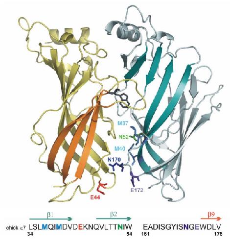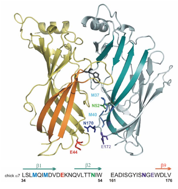 Figure 1. A model of the α7 AChR extracellular domain. Ribbon cartoon showing two of the five subunits viewed from the outside. In the subunit to the left of the central interface (yellow), the outer β sheet in is highlighted in orange, the transition zone E44 residue is orange, and the W148 residue is shown in gray to identify the ACh binding pocket (Zhong et. al., 1998). The subunit to the right shows a view of the inner sheet (teal), and other residues targeted in this study. The sequence surround mutants characterized in this study is shown beneath the cartoon: M37, M40 cyan; N52 green; N170 blue; E172 purple.