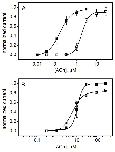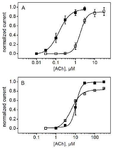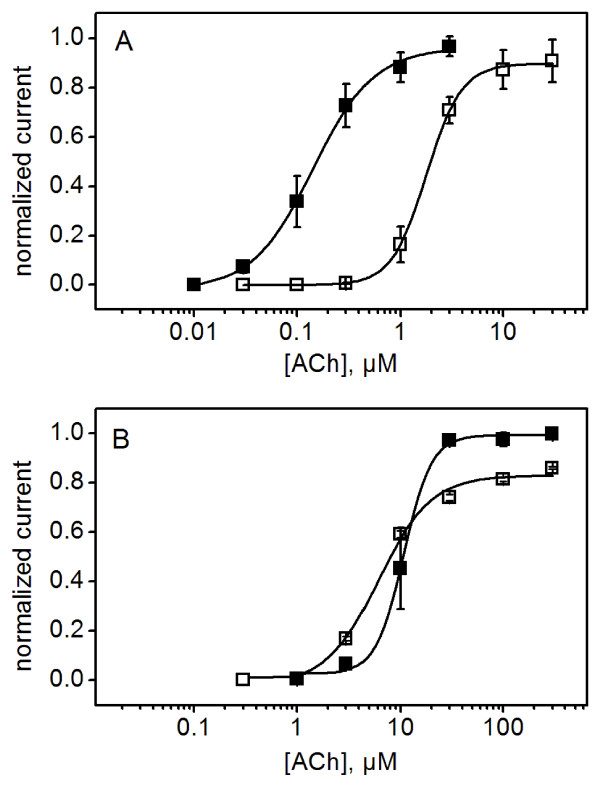 Figure 2. Positive allosteric modulation by divalent cations requires E44. ACh dose-response curves for the parental C115A/L247T (A) and the E44C mutant (B) in the absence (open squares) and presence (filled squares) of 10 mM BaCl2. Data are fitted to the Hill equation (solid lines). The positive allosteric modulation (leftward shift in the dose response curve) typically exhibited by α7 AChRs (A) is lost in the E44C mutant (B). Data are mean values (± SEM) from three determinations, normalized to the maximal value of the Hill equation fit of each data set. Hill coefficients for C115A/L247T (A): 2.5 ± 0.2 (open squares, -Ba2+), 1.9 ± 0.4 (filled squares, +Ba2+); and for the E44C mutant (B) 1.7 ± 0.2 (open squares, -Ba2+), 2.9 ± 0.7 (filled squares, +Ba2+).