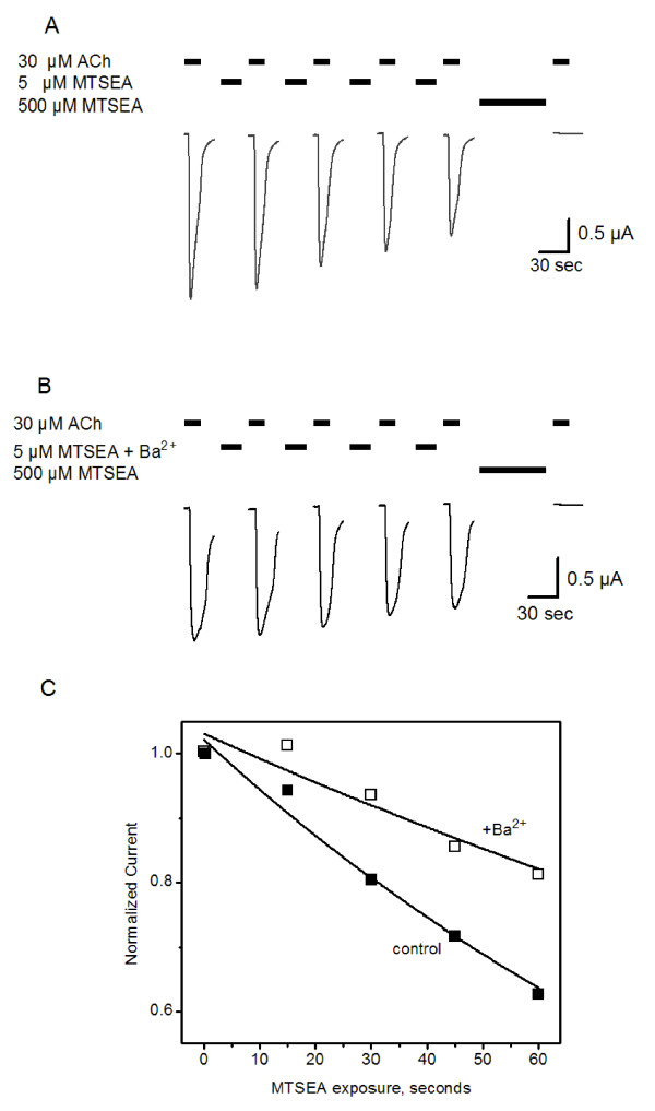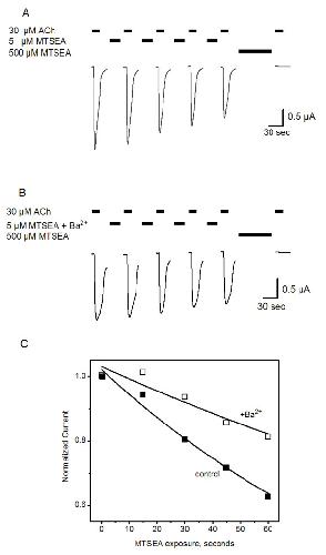Figure 3. Barium slows the rate of MTSEA modification at M37C. Example of experimental paradigm used to assess Ba2+ effects on modification rates. (A) Successive ACh-evoked current traces recorded before and after repeated exposures to MTSEA (5 μM, 15 seconds), showing a decrement in responses to 30 μM ACh. Endpoints of MTSEA modification are determined by prolonged application of 500 μM MTSEA (right). (B) The same protocol, including Ba2+ pretreatment and co-application with MTSEA. Current traces are truncated in both (A) and (B) between consecutive MTSEA applications; in all cases the currents were allowed to return to baseline prior to the next application of MTSEA ± ACh. (C) Peak current amplitudes from (A) and (B) are normalized and plotted versus total MTSEA exposure time. Data from this single experiment (no error bars) are fitted to a single-exponential decay (solid line) to extract an apparent pseudo first-order rate constant. The pseudo first-order rate constants calculated in this experiment were 0.011 s-1 and 0.0019 s-1 for control (A) and +Ba2+ (B) measurements, respectively. Second-order rate constants are calculated from these values (Figures 4–6; Table 2).
