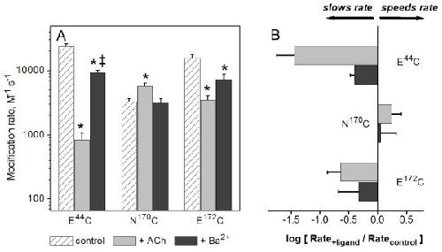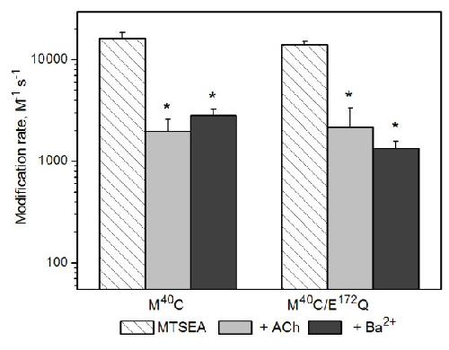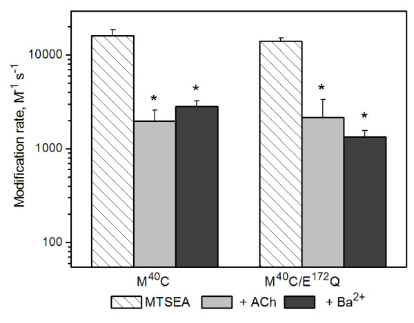 Figure 6. Charge neutralization at E172 does not alter the rate of modification M40C by MTSEA. Mean values for second-order modification rate constants for M40C (left, data from Fig. 3) compared to those obtained in receptors containing the E172Q mutation (M40C/E172Q). *Rates were significantly different from control (P < 0.05). See Table 2 for summary, including (n) for each condition.