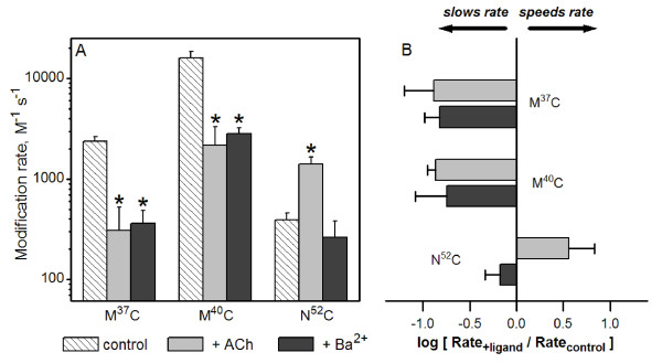 Figure 4. Barium alters the rate of MTSEA modification at inner β sheet residues. (A) Using the protocol described in Figure 3, we determined second-order rate constants for three reporter residues in the α7 AChR inner β sheet (M37C, M40C, and N52C). Mean values for second-order rate constants for modification by MTSEA alone (control), MTSEA + ACh, and MTSEA + Ba2+ are shown. * Rate was significantly different from control (P < 0.05). (B) A plot of the ratios of second-order rate constants. Ba2+ and ACh both slowed the rates of modification of M37C and M40C. At N52C, however, the rate of modification in the presence of Ba2+ was not significantly different from control, while ACh accelerated the modification rate. See Table 2 for summary including (n) for each condition.