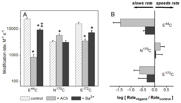 Figure 5. Barium alters the rate of MTSEA modification at residues required for modulation by divalent cations. Second-order rate constants were measured for three residues in the transition zone of the α7 AChR (E44C, N170C, and E172C). (A) Mean values for second-order rate constants for modification by MTSEA alone, MTSEA + ACh, and MTSEA + Ba2+. Ba2+ caused a significant decrease in MTSEA modification rates of both E44C and E172C, despite the loss of divalent cation-dependent modulation. Ba2+ did not have a significant effect on the modification rate of N170C, although ACh significantly increased the rate of modification of this residue. *Rate was significantly different from control (P < 0.05). ‡Rate was significantly different from that obtained in presence of ACh (P < 0.05). The plot of rate constant ratios (B) shows that the effect of Ba2+ on the rate of modification of E44C was significantly less than the effect of ACh. See Table 2 for summary including (n) for each condition.