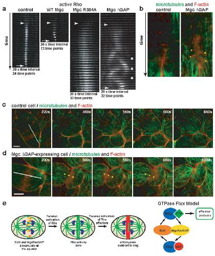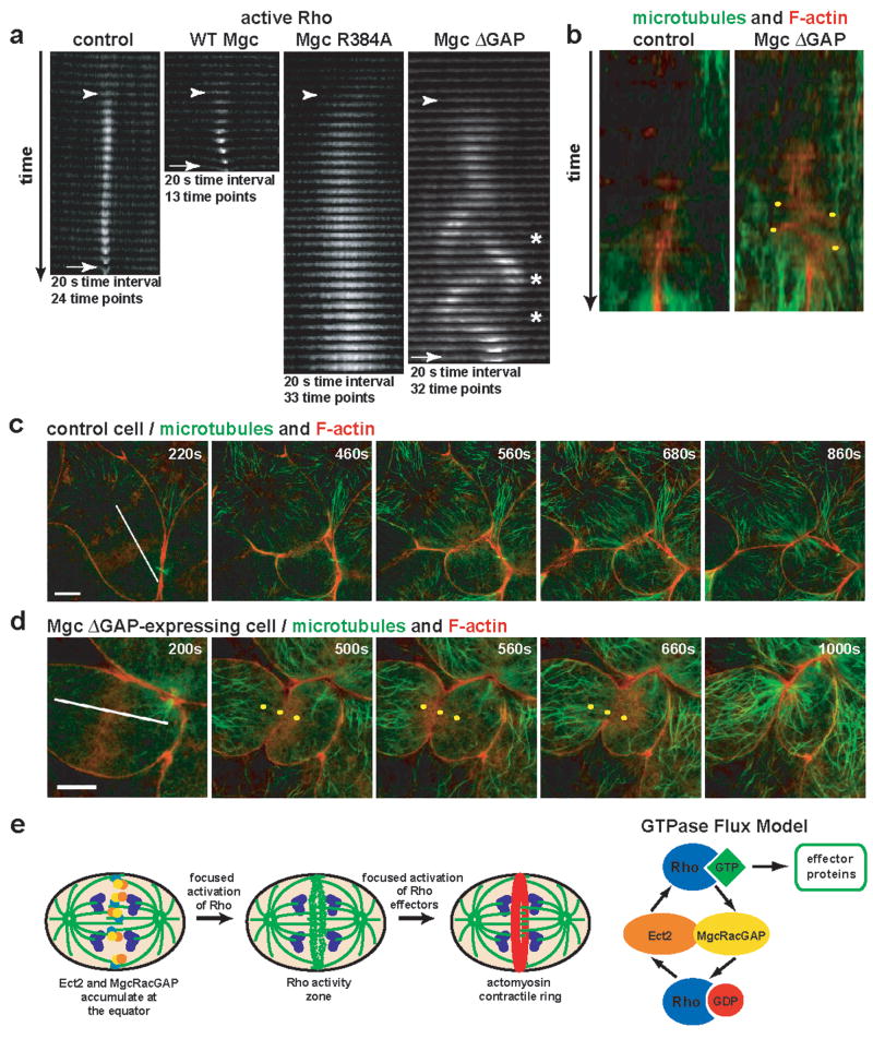 Figure 4. Rho activity zones in MgcRacGAP ΔGAP-expressing cells oscillatea, z-stack cross-section kymographs of the region where the Rho activity zone is forming for control, WT Mgc-, Mgc R384A-, or Mgc ΔGAP-expressing cells. Appearance of the Rho activity zone is marked with an arrowhead, and the furrow is marked with an arrow. Asterisks indicate places where the Rho activity zone splits. b, Kymographs made along the lines shown in the first frame of c and d. Yellow dots indicate F-actin oscillations. c–d, Control (c) or Mgc ΔGAP-expressing cells (d) were co-injected with EMTB-3XGFP to monitor microtubules (green) and mChe-UtrCH to monitor F-actin (red) and imaged during cytokinesis. Frames from time-lapse movies are shown. Yellow dots in d are fiduciary marks to help visualize the F-actin oscillations. Scale bars, 20 μm. e, Model showing that equatorial accumulation of Ect2 and MgcRacGAP leads to focused activation of Rho, which in turn leads to focused activation of Rho effectors. Our results are consistent with the GTPase flux model, suggesting that Ect2 locally activates Rho, while MgcRacGAP counterbalances Ect2 by locally inactivating Rho, keeping Rho in a constant state of flux through the GTPase cycle and maintaining a focused Rho activity zone at the cell equator.